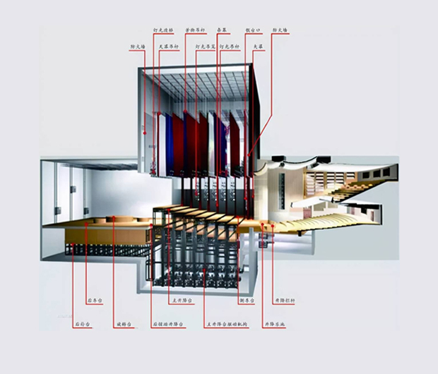 臺上設(shè)備:舞臺內(nèi)從臺口線到天幕分布著以下幾種機(jī)械設(shè)備:大幕機(jī)、幕類吊桿、二道幕機(jī)、燈光吊桿等。